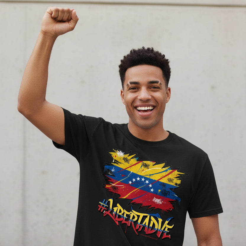 Make a powerful statement with the #LIBERTADVE T-Shirt, featuring a bold distressed Venezuelan flag graphic with graffiti-style lettering. This design captures the spirit of resistance, hope, and the unwavering call for freedom in Venezuela. More than apparel—it's a movement you can wear.